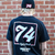 The back of the tee showcases a striking design centered around the number "74" in a vintage flat track style font, embodying the grit and adrenaline of the racing world. A bold red and white box frames the graphic, creating a standout visual that captures the spirit of competition. The Davey Todd script, subtly inspired by cowboy and flat track aesthetics, adds a rugged yet elegant touch to the design, perfectly complementing the overall theme.